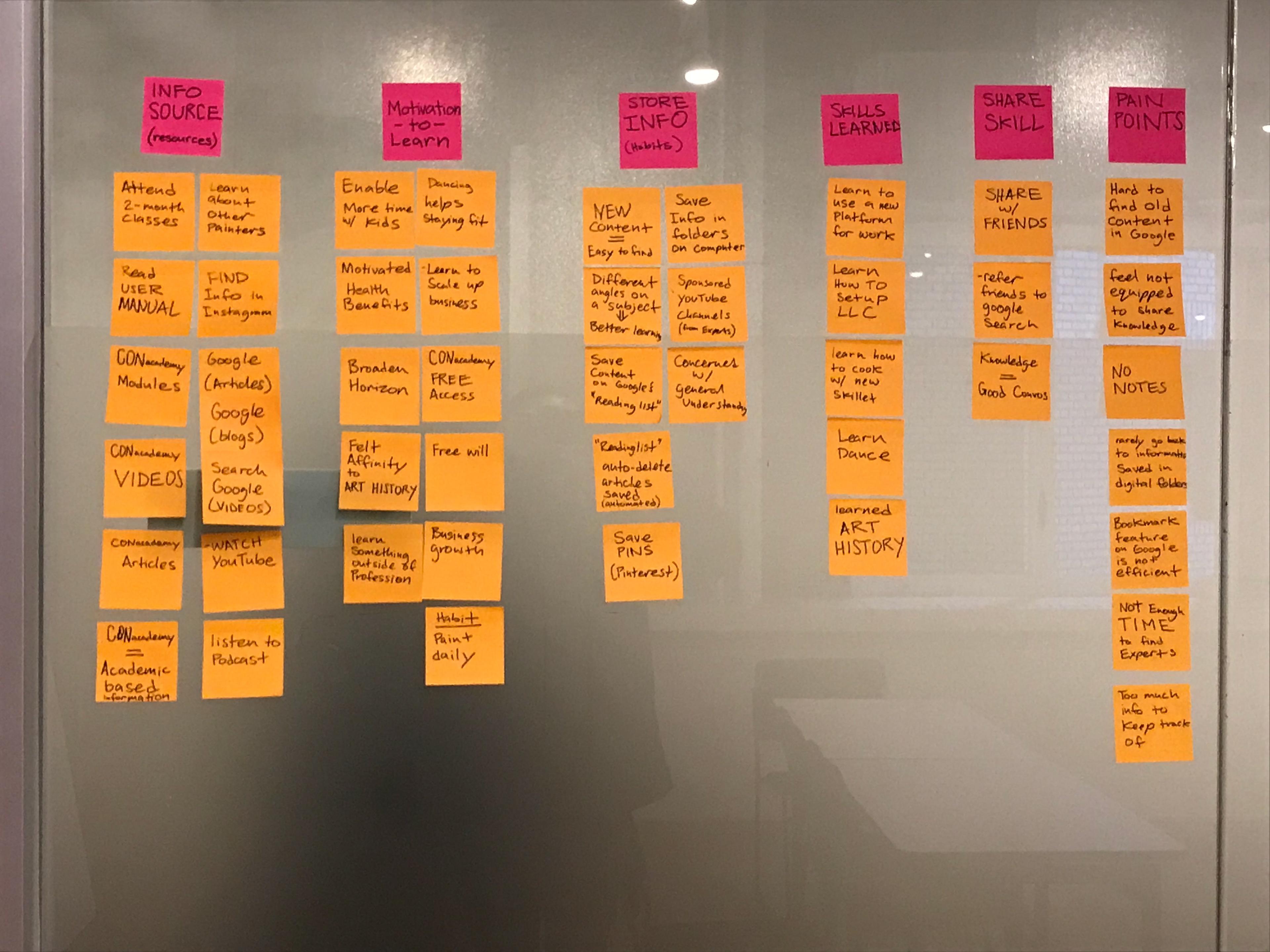 I set out to conduct user interviews with 7 young professionals to learn about their personal experiences in lifelong learning. With the information I received in those conversations, I utilized the affinity mapping methodology to identify patterns and trends. As a result, I was able to obtain insight on their motivations, pain points and approach in learning new skills.